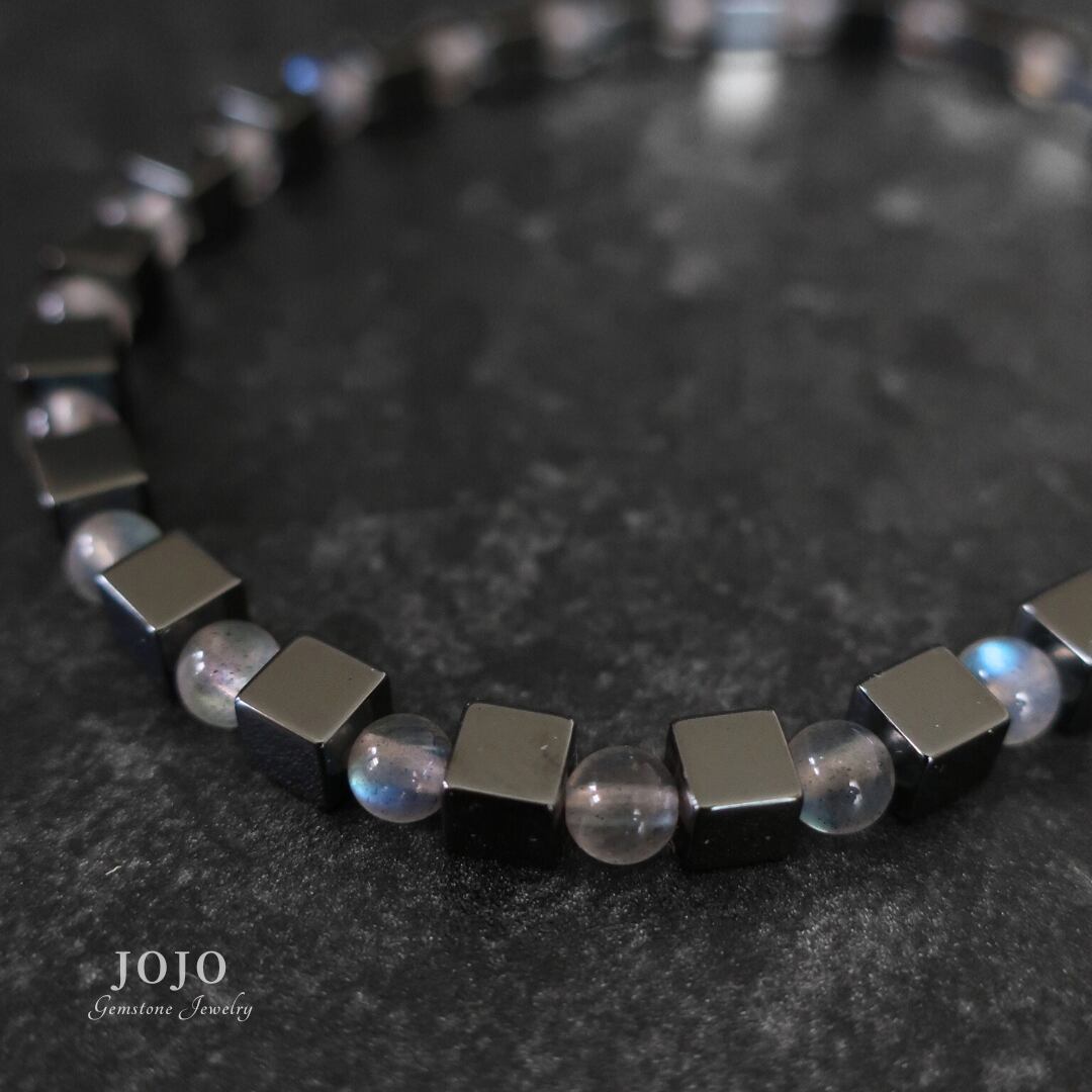 メタリックな質感のヘマタイトキューブと、透明感のあるラブラドライトのラウンドビーズを交互に配した一本。