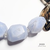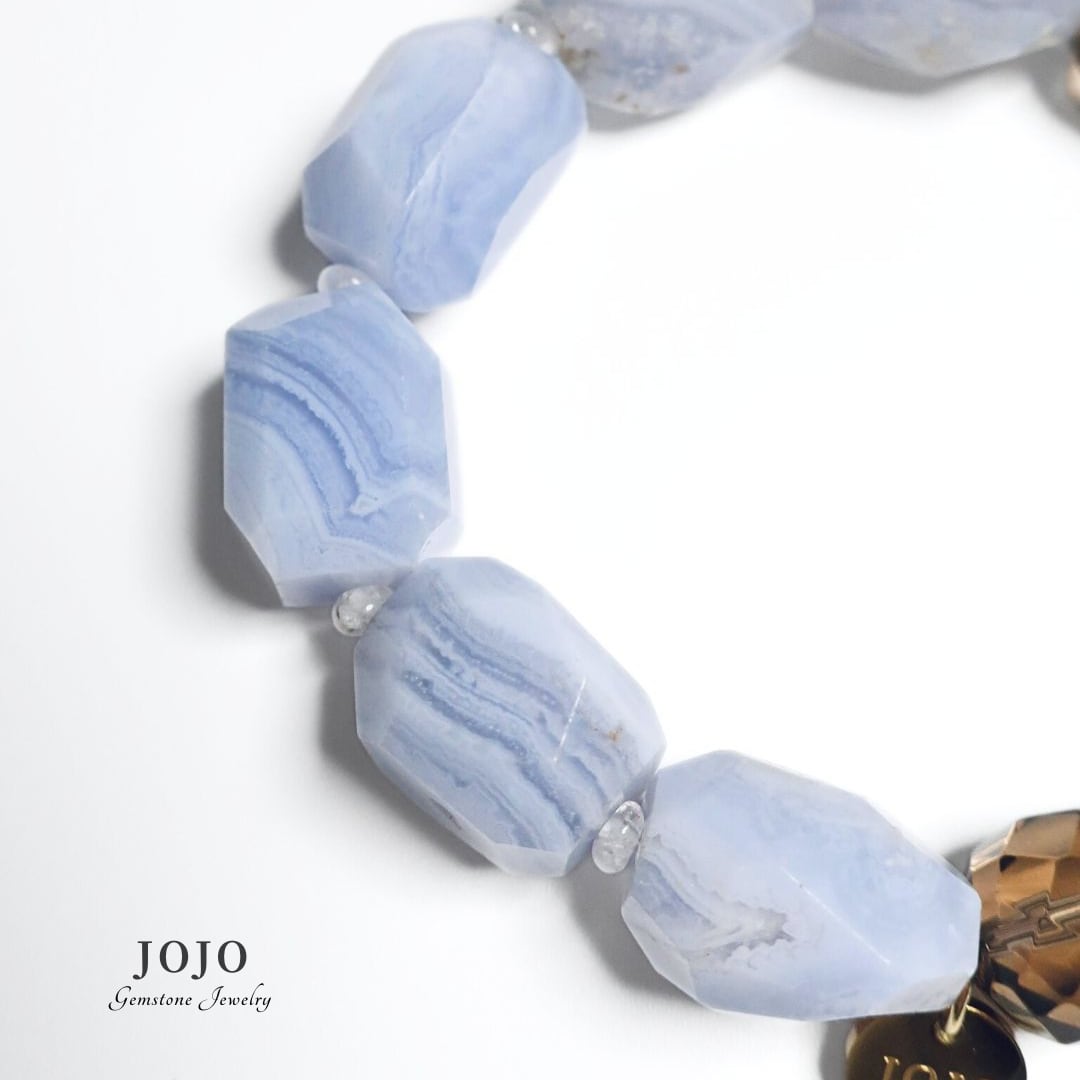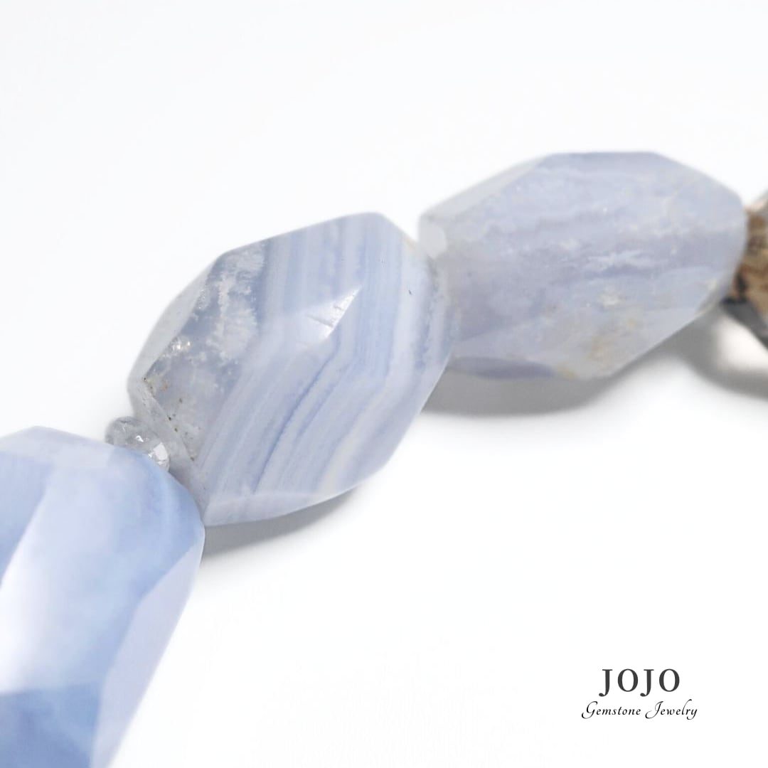 ブルーレースアゲートのファセットナゲットは、淡く繊細な縞模様が浮かび上がり、角度によって異なる表情を見せます。