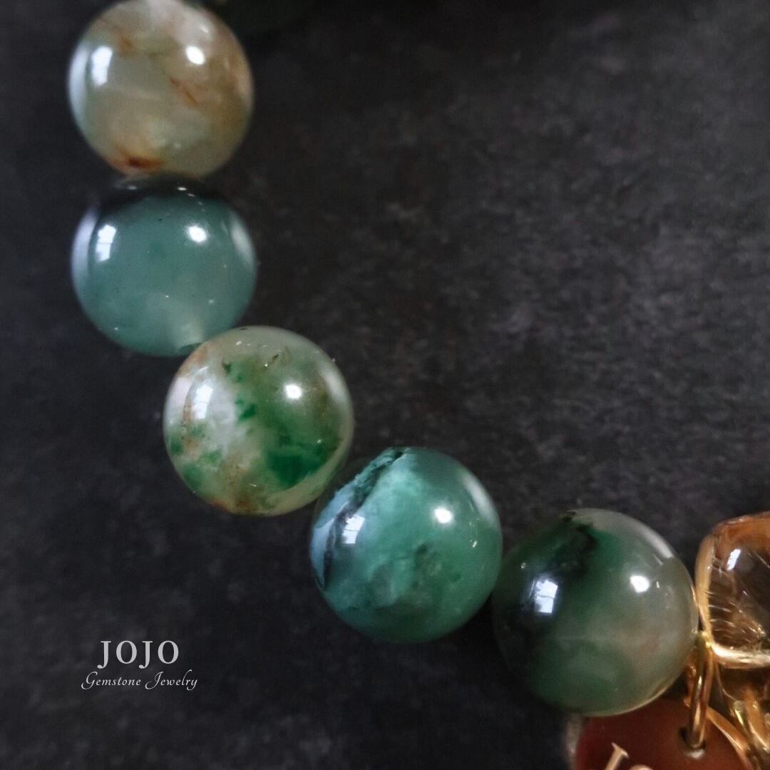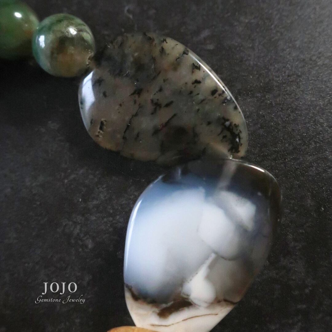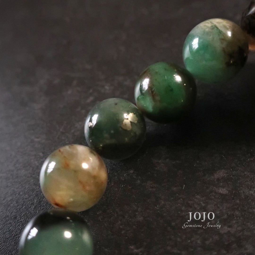 淡いグリーンから深みのある色合い、白を含む粒やわずかに赤みを帯びた粒まで、天然石ならではの奥行きが連なります。