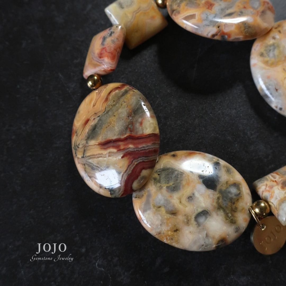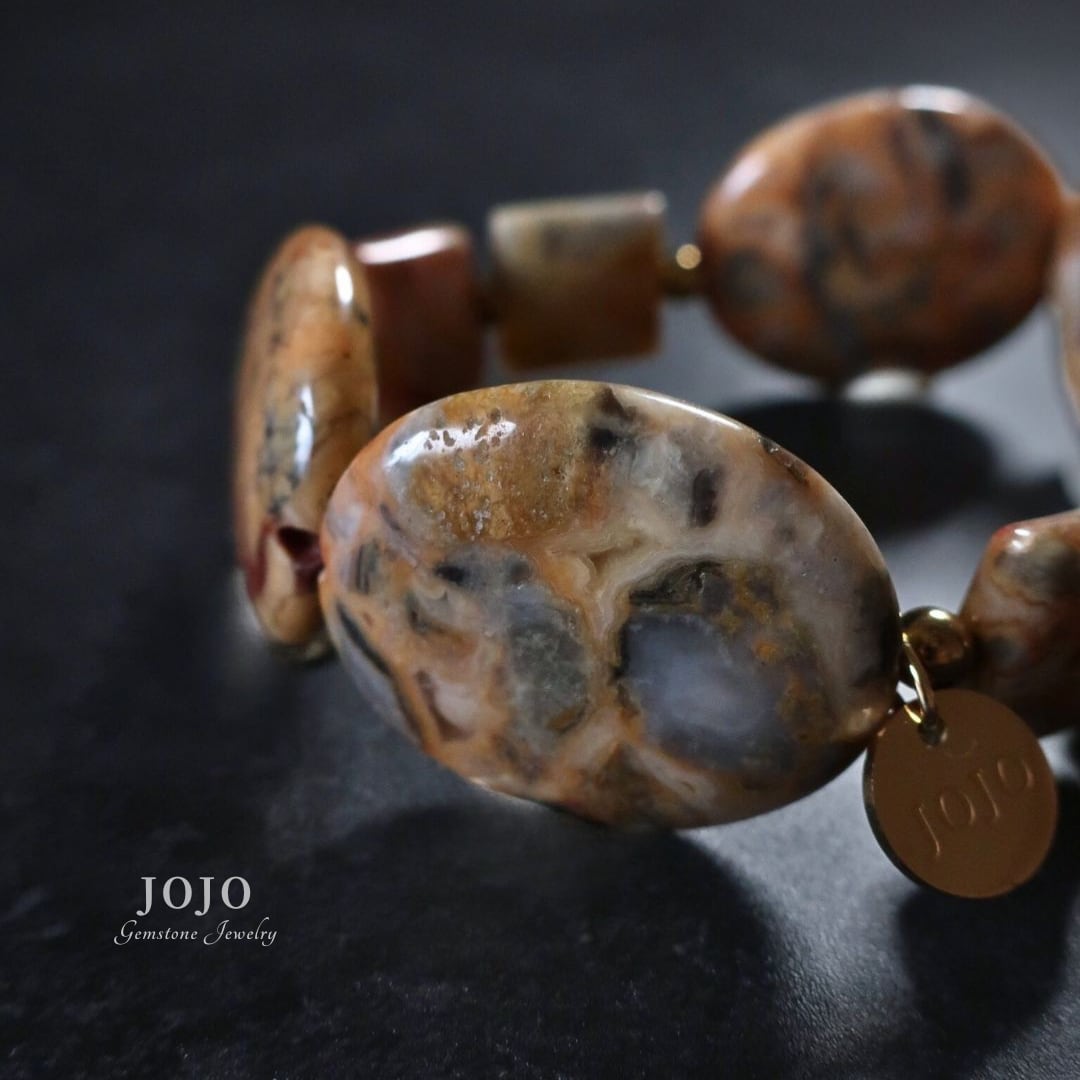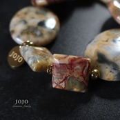 まるで天然石のキャンバスに描かれたアートのような模様が印象的で、大ぶりのオーバルは確かな存在感を放ちながらも、柔らかな色合いが肌に自然となじみ、派手になりすぎません。