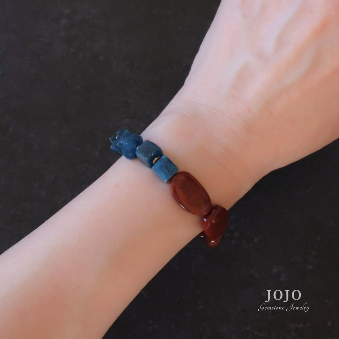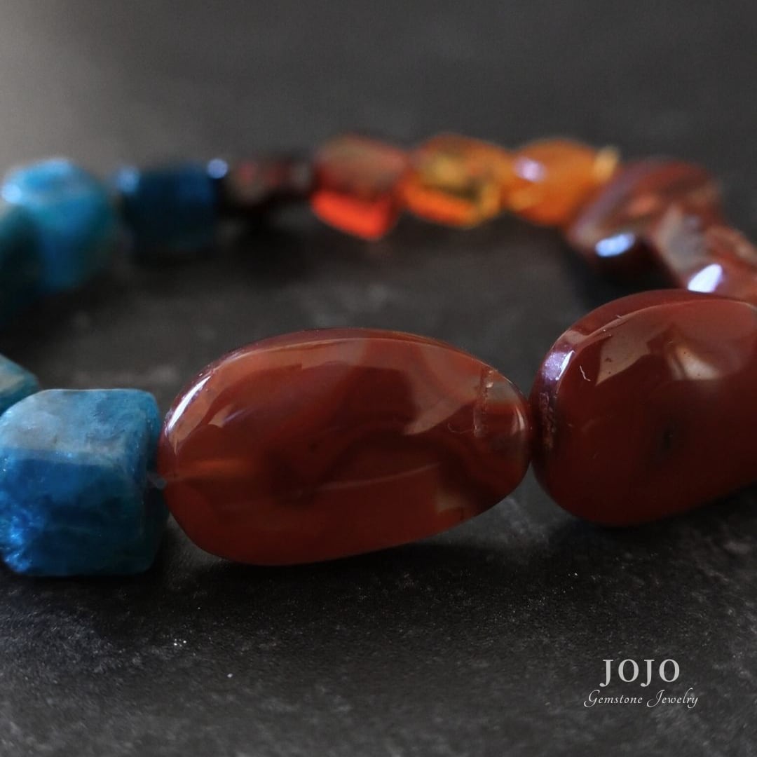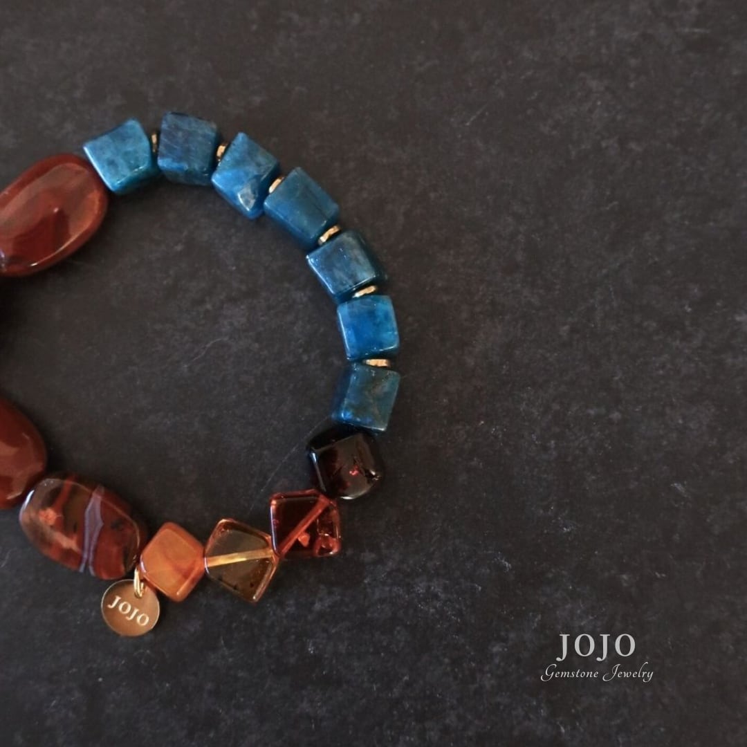 異なる時間と場所で生まれた石たちが、色と質感のコントラストでひとつにつながるブレスレット。