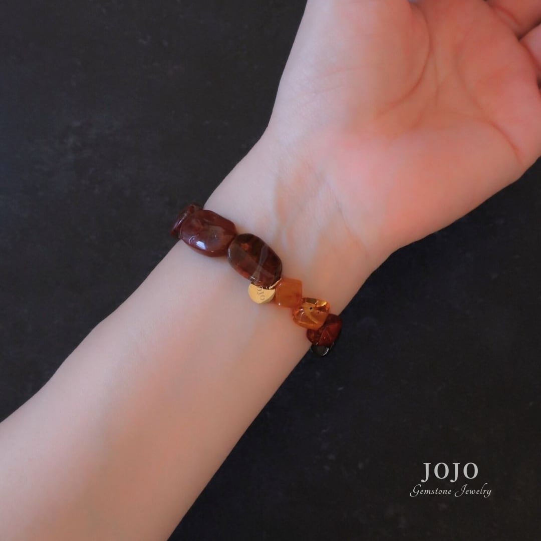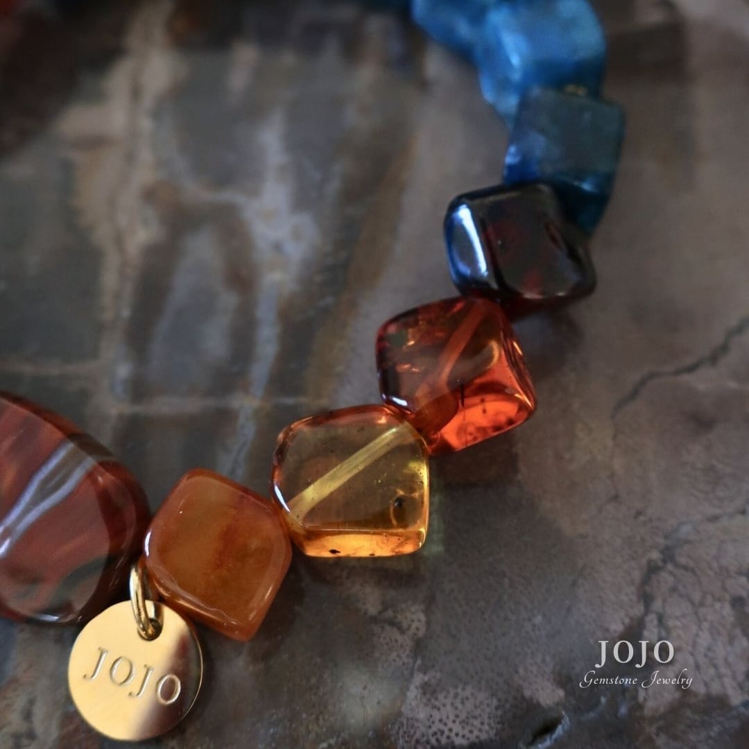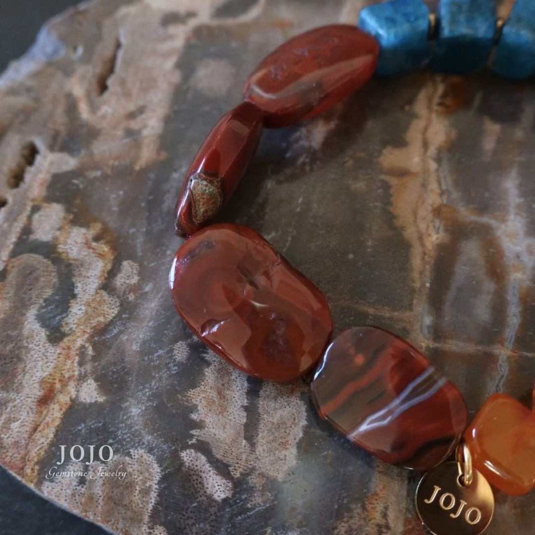 異なる時間と場所で生まれた石たちが、色と質感のコントラストでひとつにつながるブレスレット。