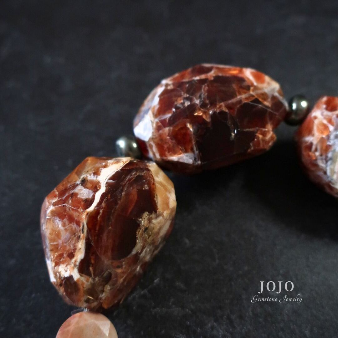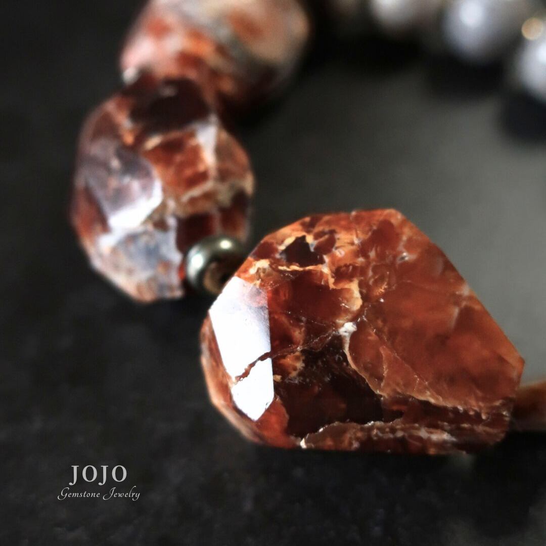 オパールの間にパイライト、アゲートの間にヘマタイトのロンデルをあしらい、全体にリズムと軽やかな輝きをプラス。