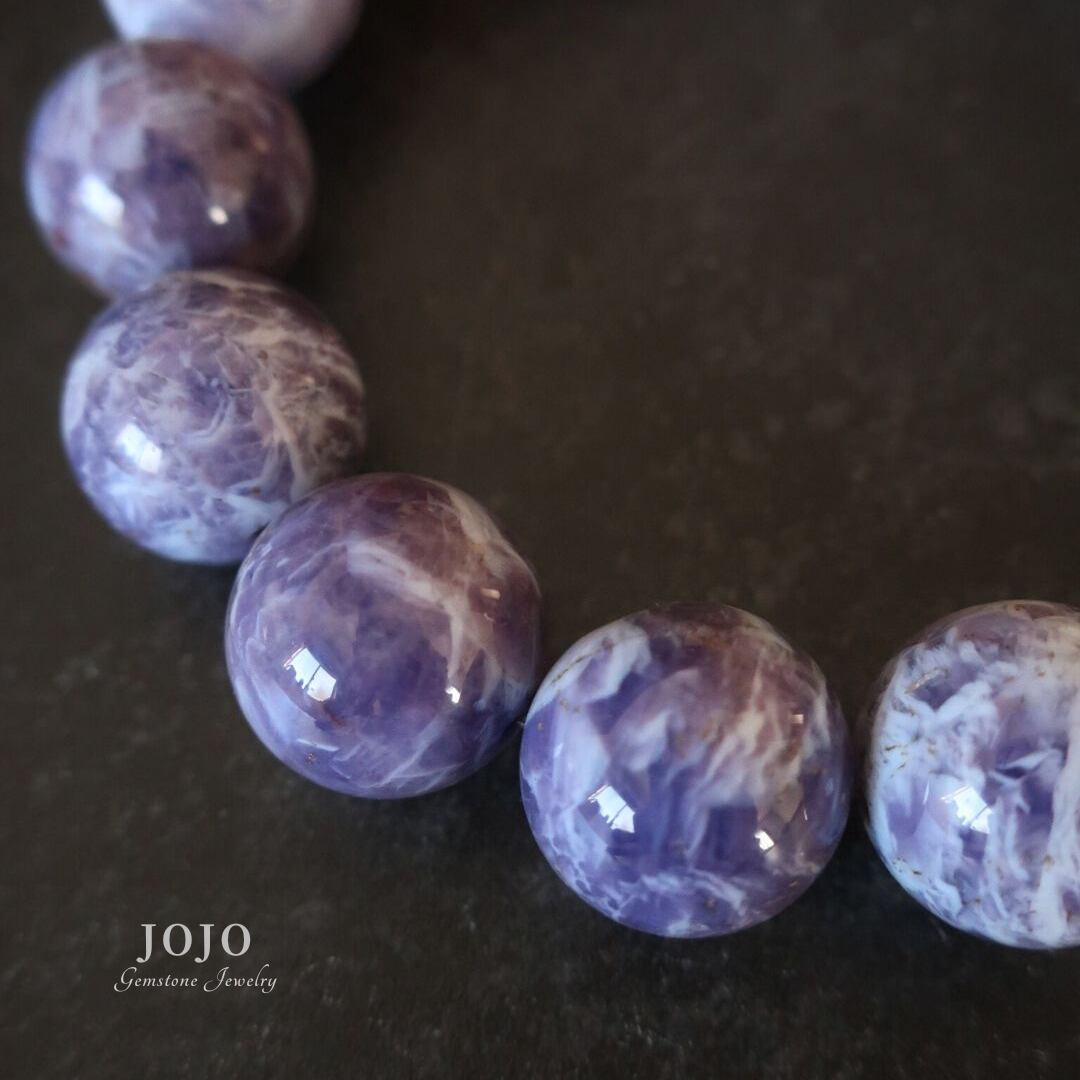 紫と白が溶け合い、粒によってきらりと光る内包物や、ふわっと浮かぶシラーがのぞくなど、それぞれに異なる表情が楽しめます。