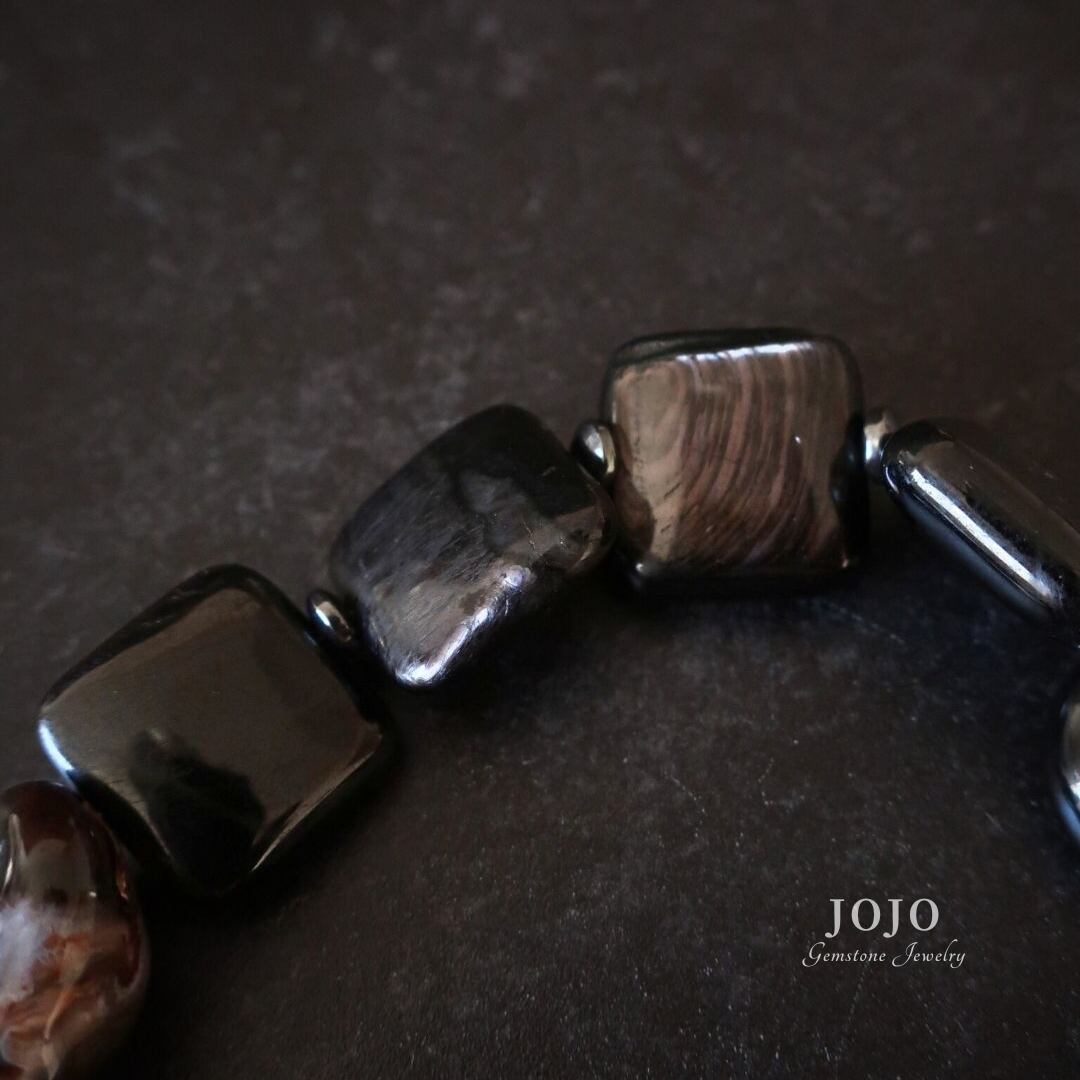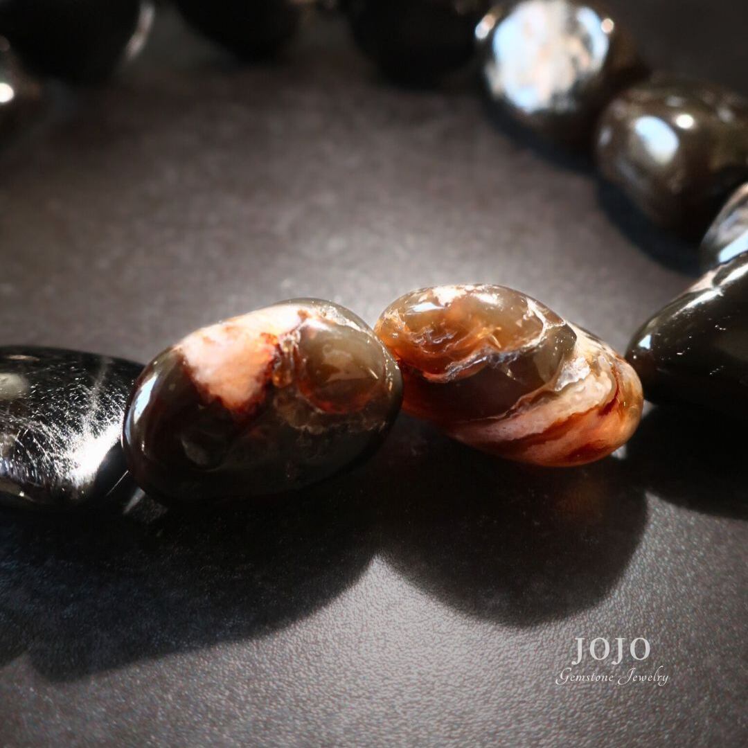 ブラックやブラウンが溶け合う中に、ホワイトやクリアの層模様が現れ、粒によってはオレンジがかったイリデッセンスがほのかにきらめきます。