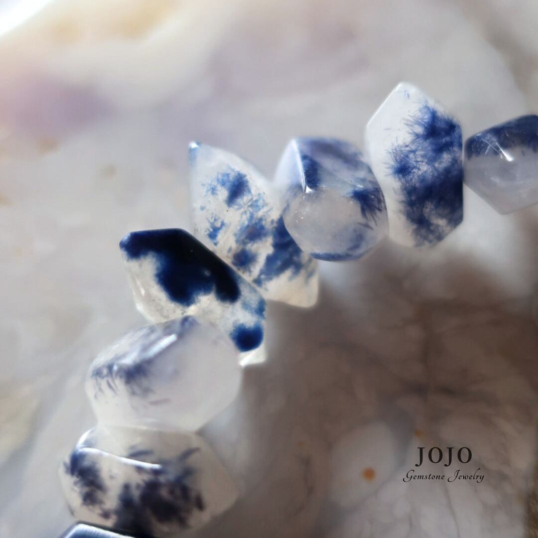 ミルキーなクォーツの中に、濃く鮮やかなブルーの針状インクルージョンが広がります。