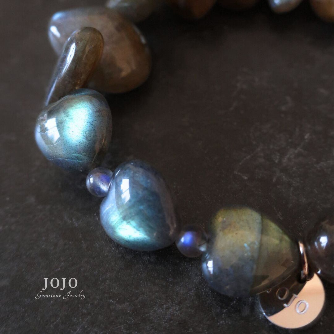 ハートの間に配した小粒もラブラドライトで、さりげなく輝きを添えています。