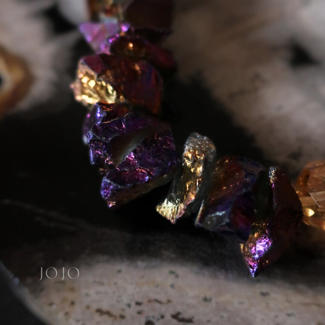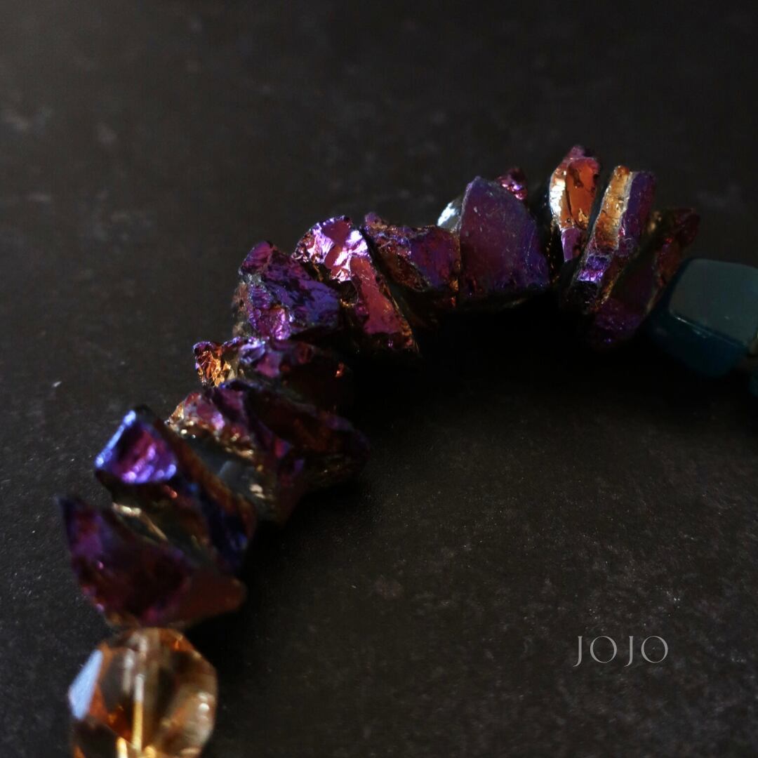 玉虫色の蒸着が光を受けてメタリックに輝き、他の石では出せないインパクトを添えています。
