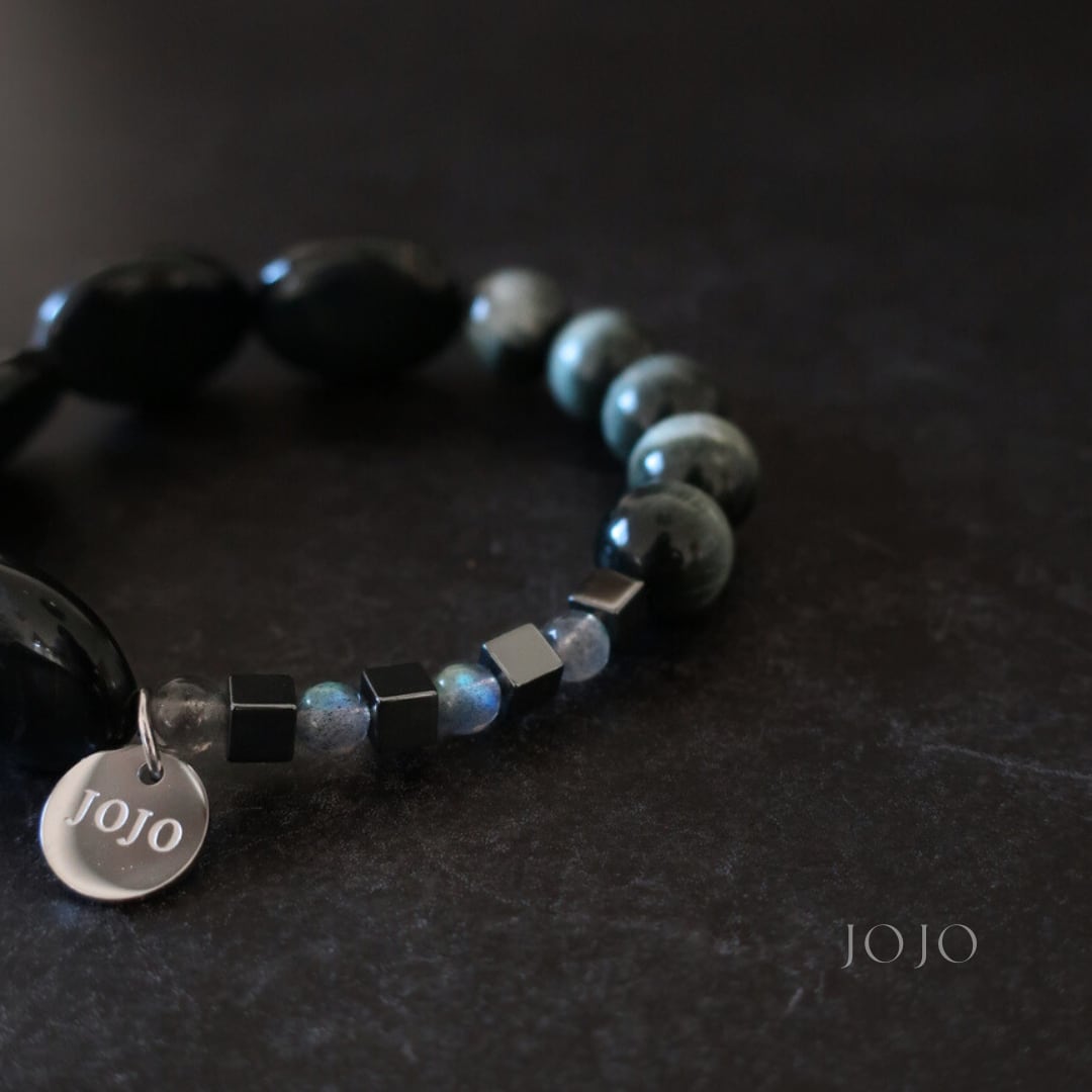 シャトヤンシーやシラーなど、角度によって表情を変える光を持つ天然石を組み合わせ、深みのあるダークトーンにまとめました。