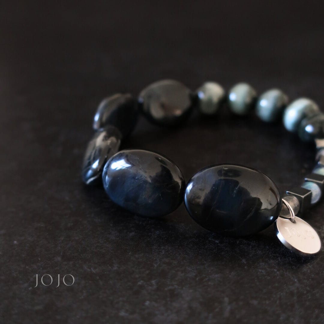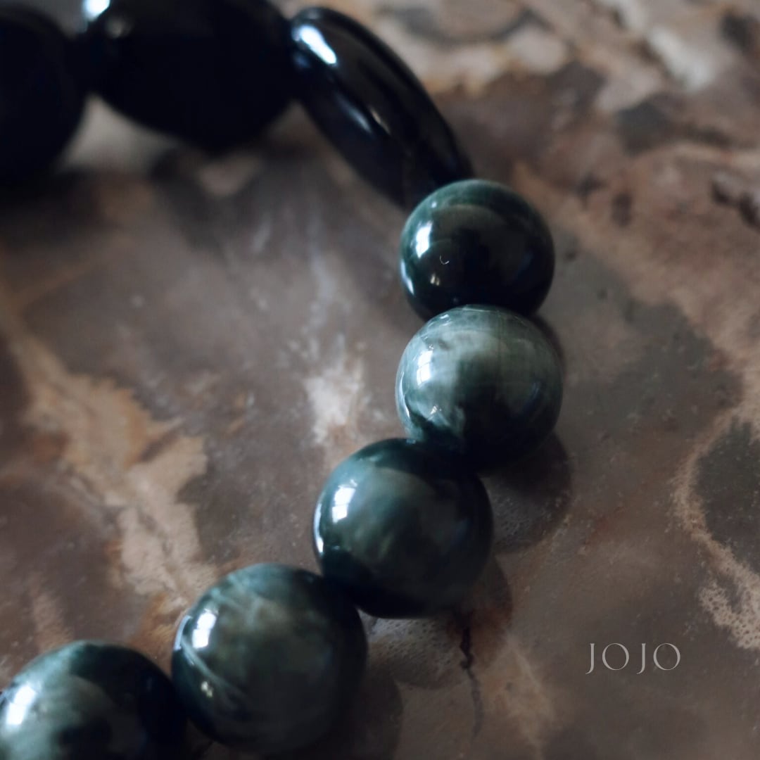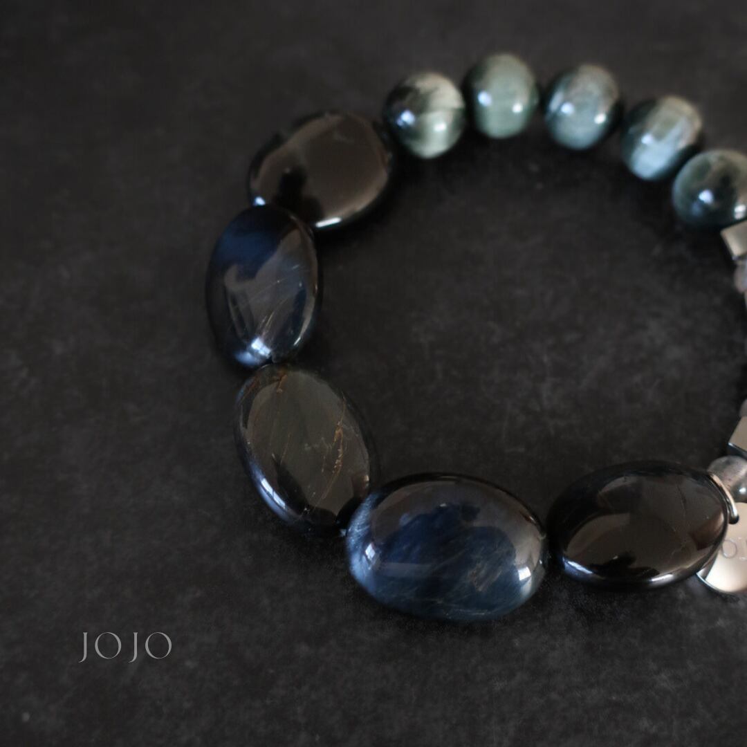 一見するとブラックのように深い色合いですが、光の角度によってブルーのシャトヤンシーが浮かび上がり、静かで神秘的な輝きを見せます。