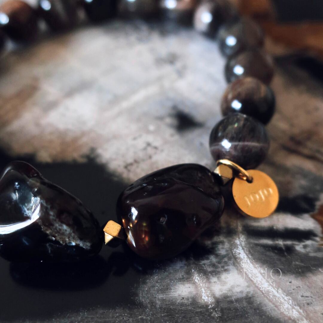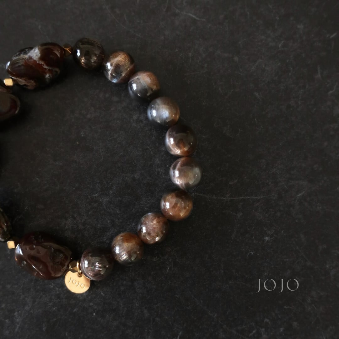深みのあるブラウンやブラックを基調にまとめた、落ち着いたトーンのブレスレット。