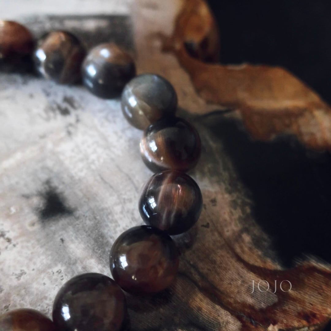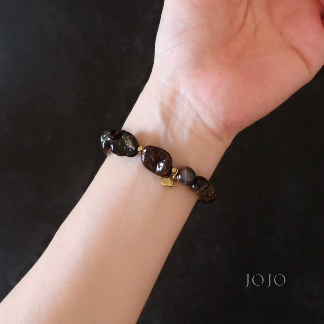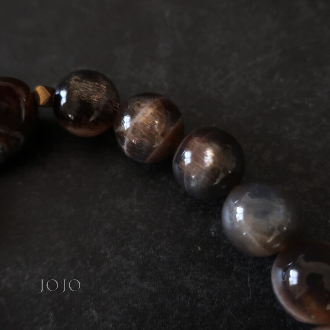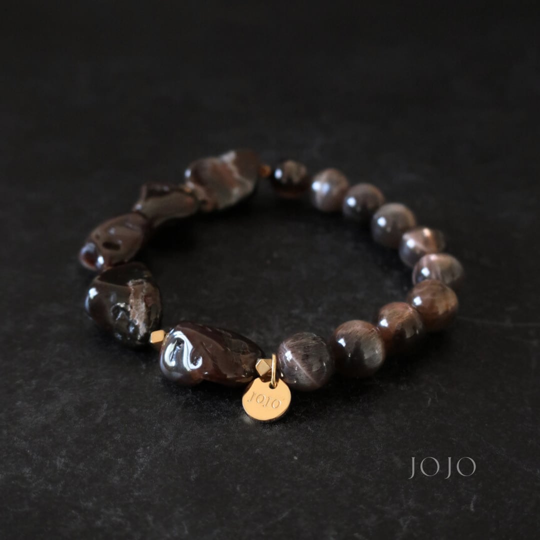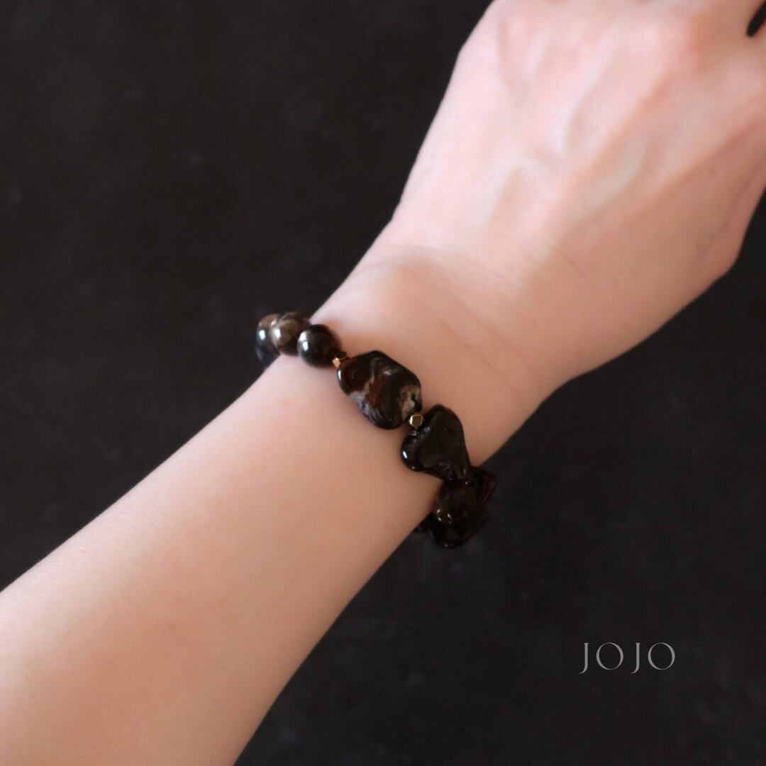 レザーやシルバーアクセサリーとも相性が良く、カジュアルからモードなスタイルまで幅広く合わせやすい、性別を問わず楽しめる、大人の天然石ブレスレットです。