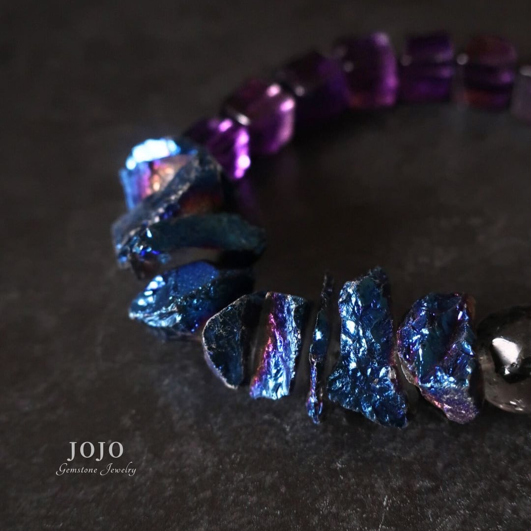 ブルーを基調とした玉虫色の蒸着が、光を受けるたびメタリックに輝き、他の石では出せないインパクトを添えています。