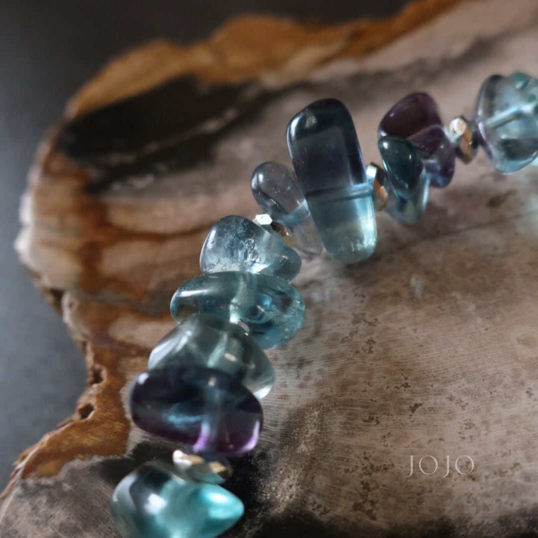 フローライトの間には、シルバーカラーのヘマタイトロンデルを使用。