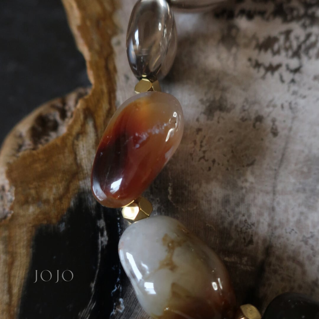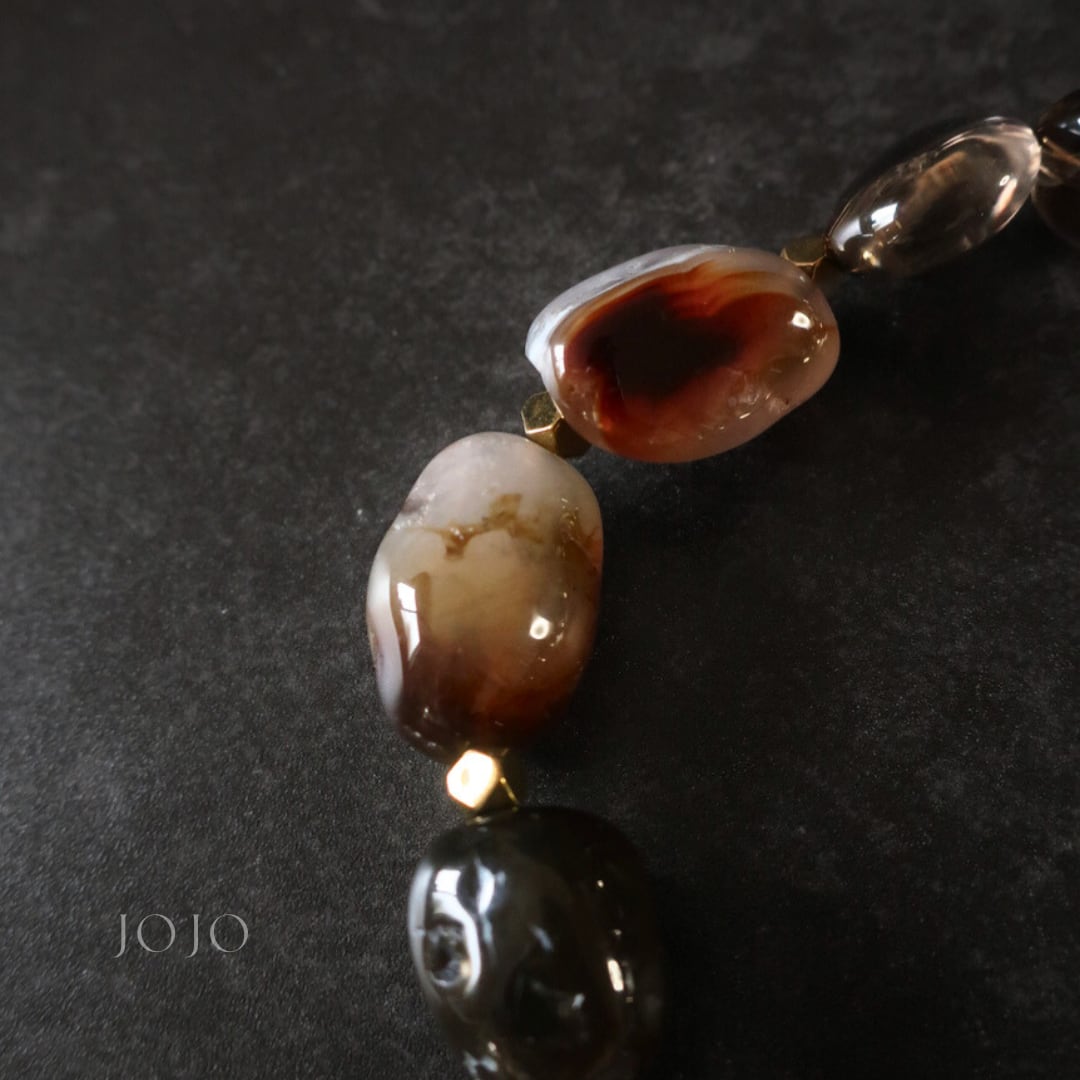ブラウンとホワイトが溶け合う深い色合いの中に、クリアの層模様が浮かび上がり、ひと粒ごとに異なる景色を見せてくれます。