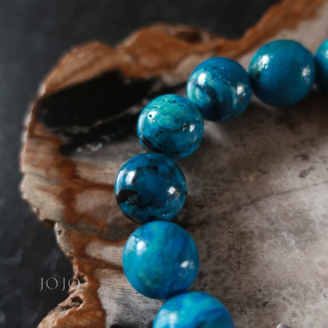 鮮やかなブルーの濃淡がひと粒ごとに異なり、空や水面を思わせる奥行きのある色合いが広がります。