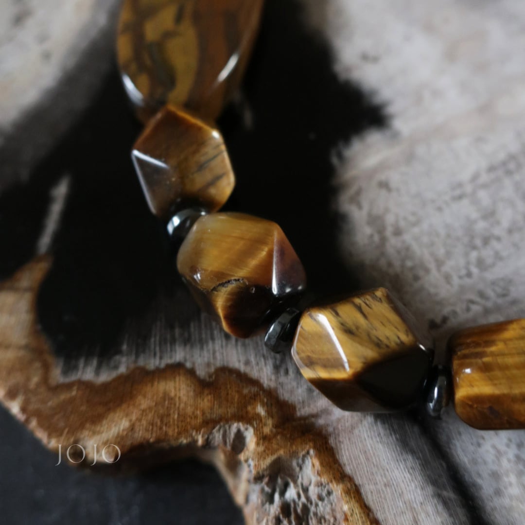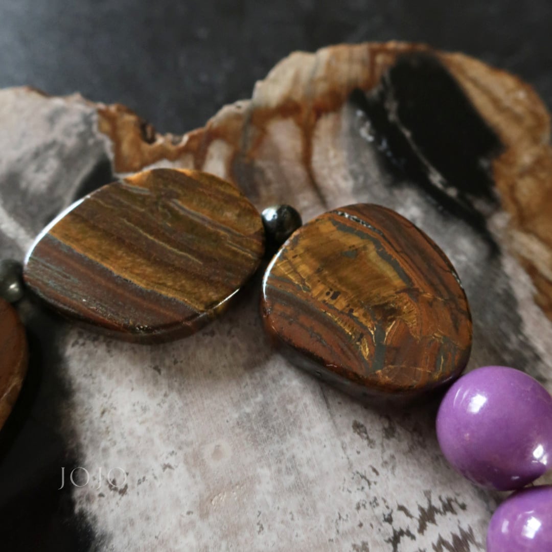 タイガーアイにヘマタイトやジャスパーが混ざり合うことで生まれた複雑な模様が特徴で、ブラウンの濃淡の中にメタリックな輝きが走ります。