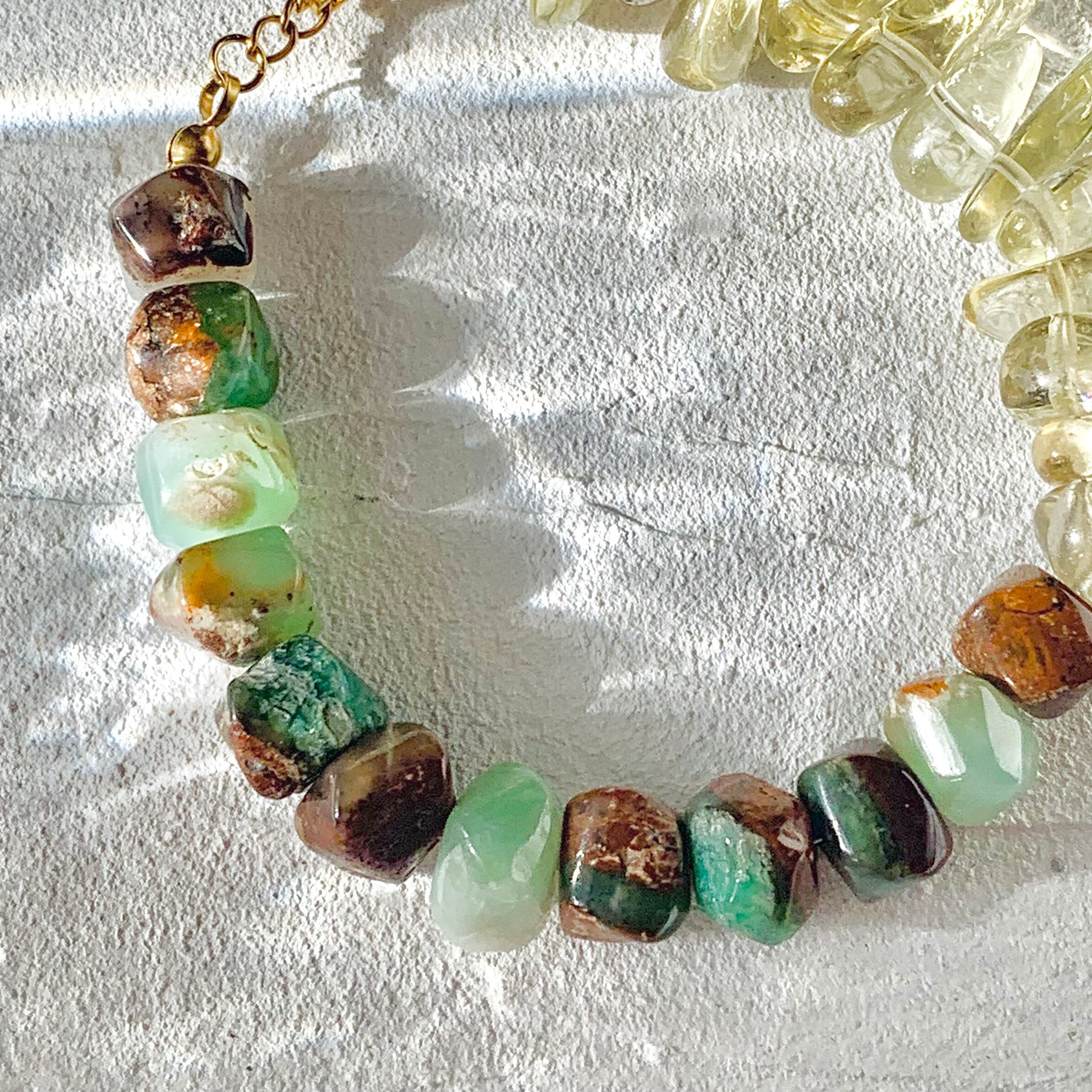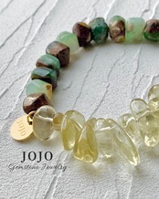 爽やかなアップルグリーンと母岩のブラウンのコントラストが印象的なクリソプレーズと、フレッシュな果汁のようなレモンクォーツを合わせたワイヤータイプのブレスレット。