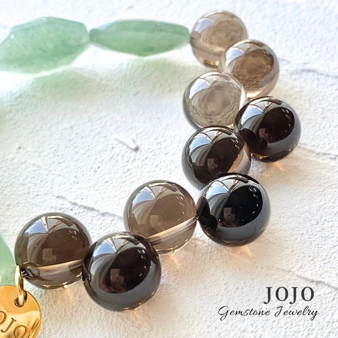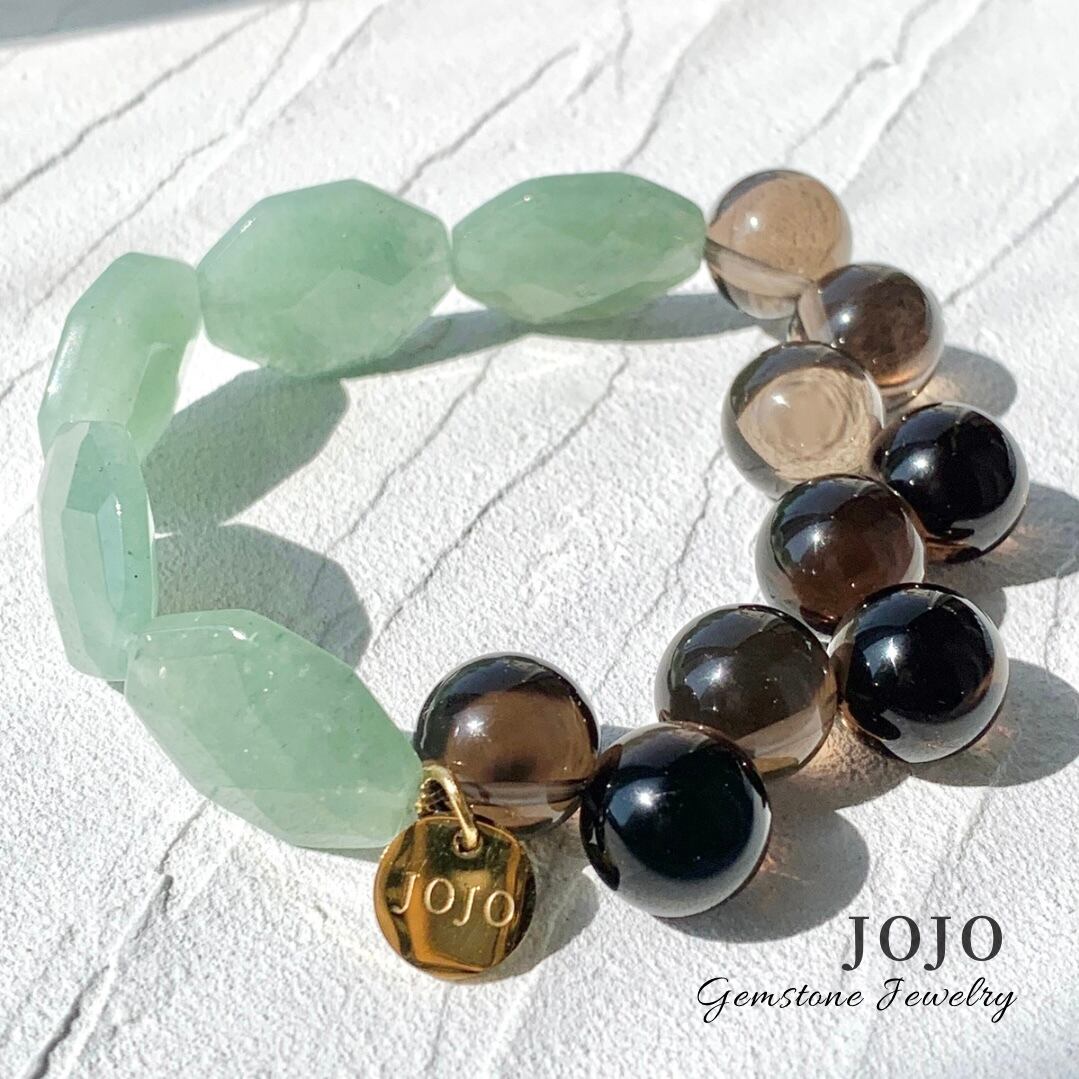 柔らかいカットを施した優しいくすみグリーンのアベンチュリンに、コロコロとランダムに手首を転がり跳ね回るようなスモーキークォーツを合わせ、落ち着いたカラーリングながら遊び心も忘れない大人の為のブレスレットに仕上げました。