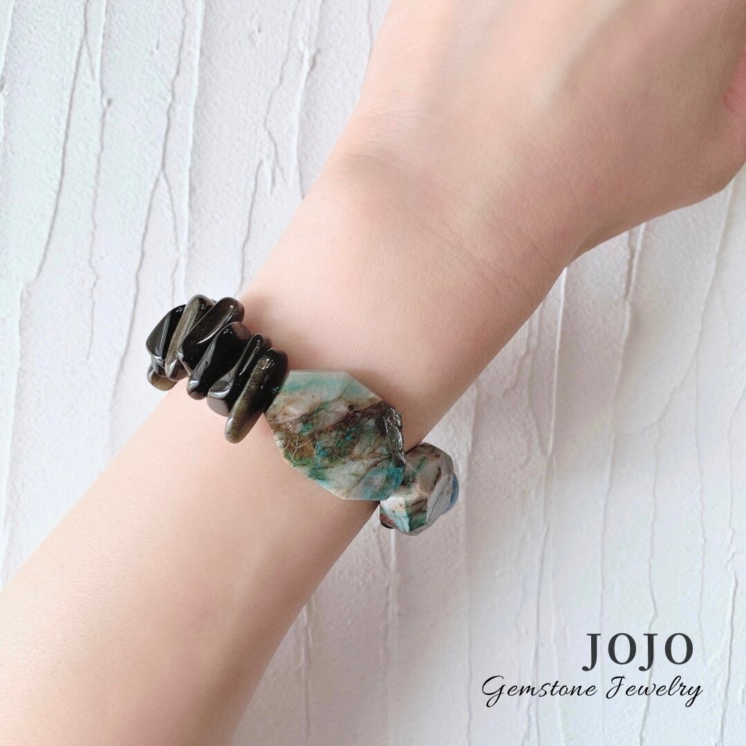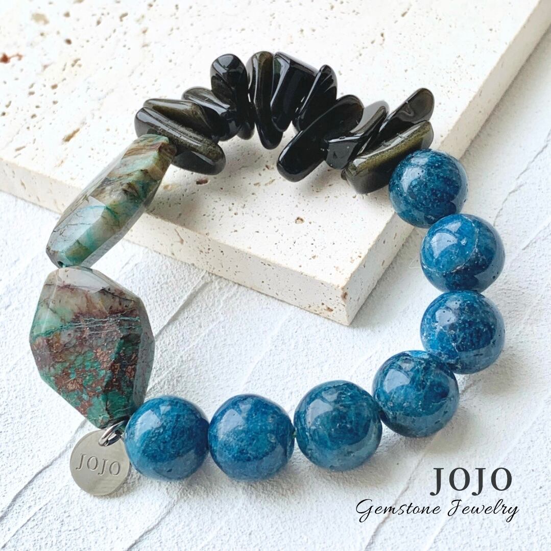 月夜の海のような、吸い込まれそうな深いインディゴブルーのアパタイトに、宇宙をイメージさせるような黒をベースにそこに浮かぶ星雲を思わせる金色のシラーが神秘的なゴールデンオブシディアンのチップと、緑の大地をそのまま切り取ったような、磨かれすぎないワイルドな質感のクリソコラインクォーツを合わせたクールな大人のブレスレットです。