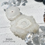 磨きが美しいパイライトのラフタンブルと、一粒のダルメシアンジャスパーをポイントに添えて、どこから見ても寸分の隙もないデザインのブレスレットに仕上げました。