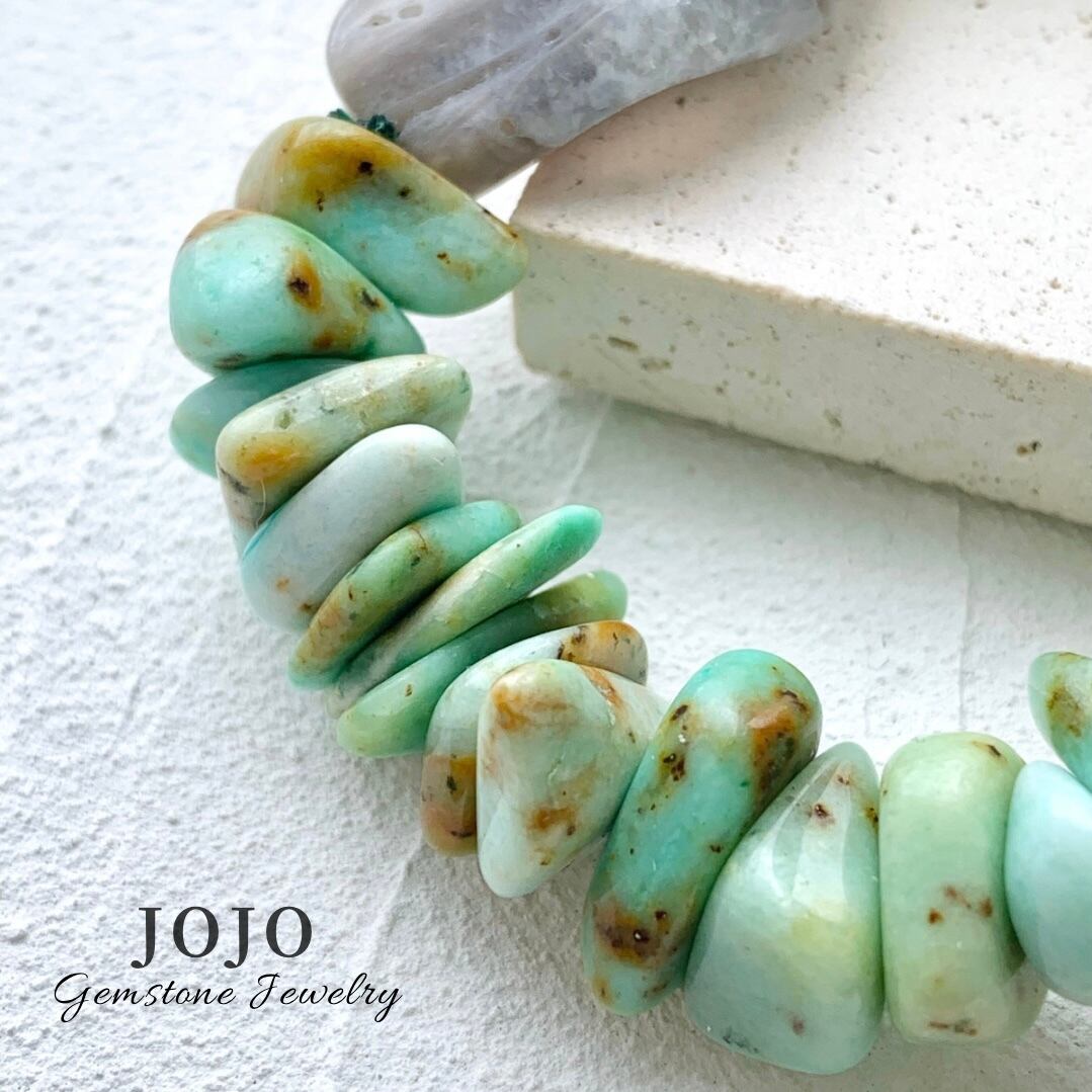 柔らかいカットを施した優しいくすみグリーンのアベンチュリンに、母岩のブラウンをあえて残したナチュラル感のあるアマゾナイトのチップを合わせました。
