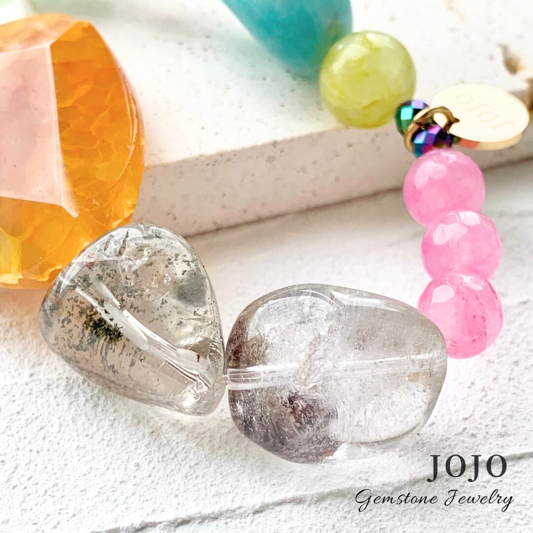 ビビッドなオレンジ色のドラゴンアゲートやエメラルドグリーンのアマゾナイトに、カナリアイエローやピンク、ライトパープルなどの石を合わせたカラフルポップなブレスレット。
