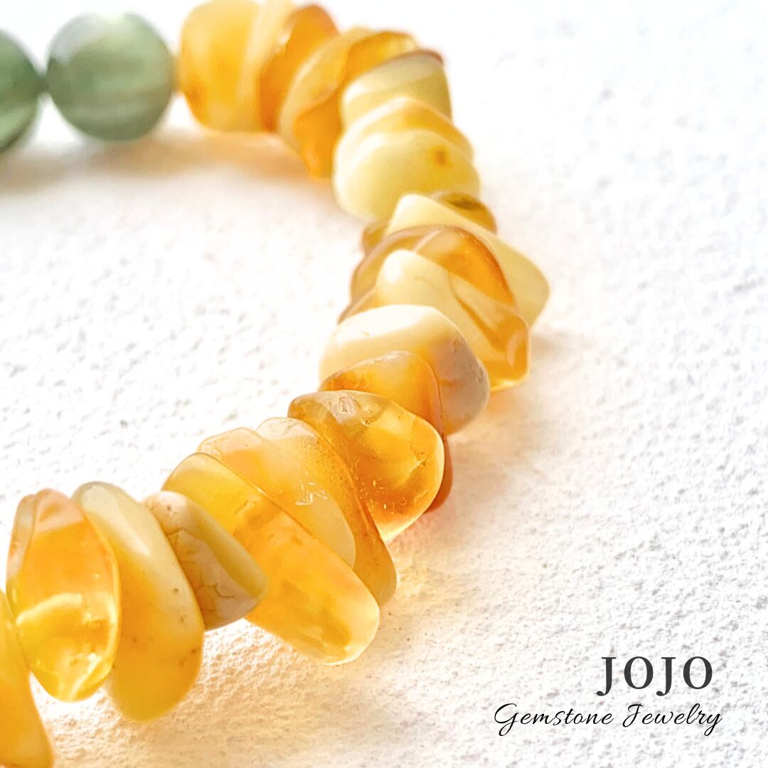 お抹茶の飴玉のようなコロコロ可愛いグリーンマイカと、蜂蜜を固めたようなアンバーのチップを合わせた、和スイーツのようなブレスレット。