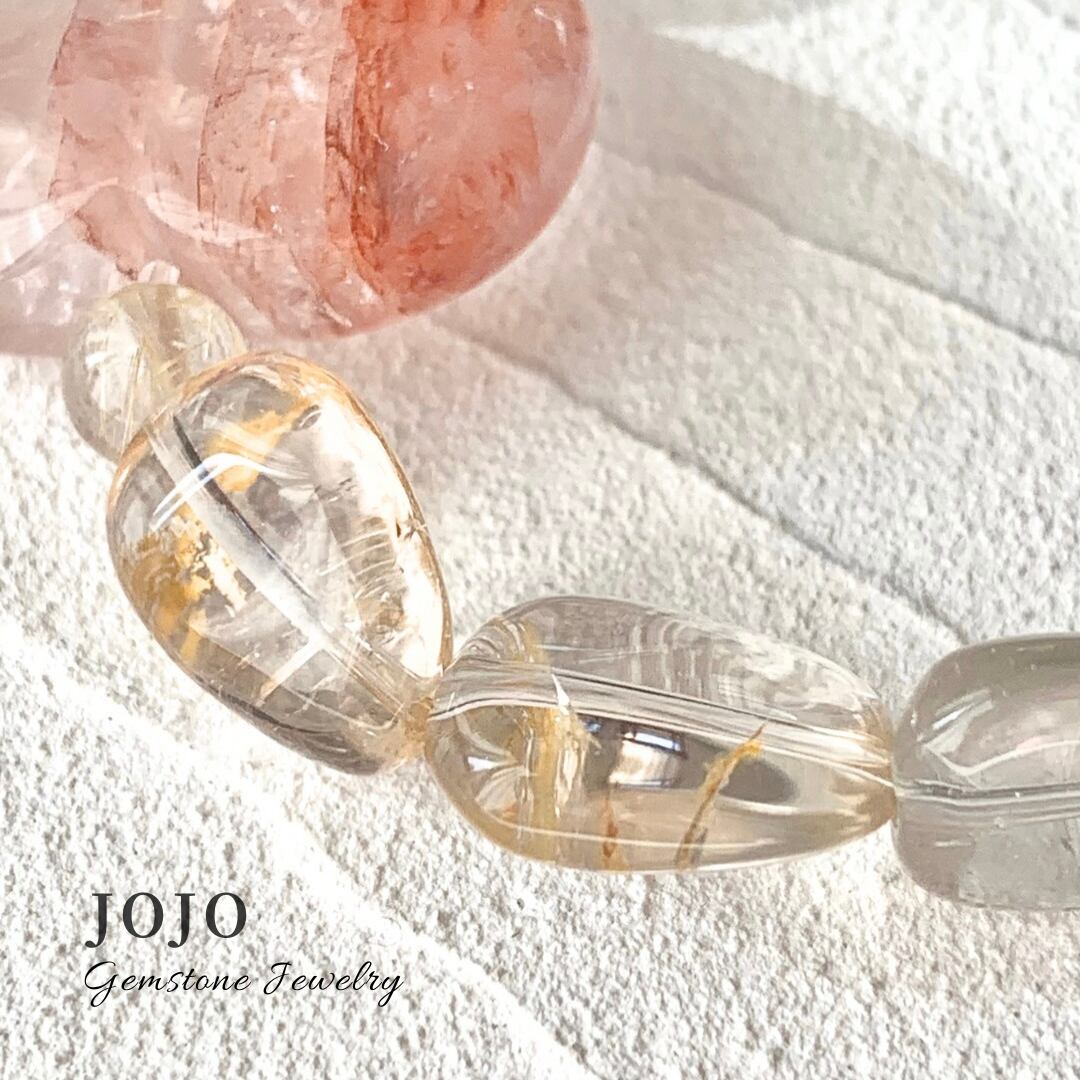 ルチルクォーツとゴールドコーティングヘマタイトのロンデルもさりげなく輝きます。