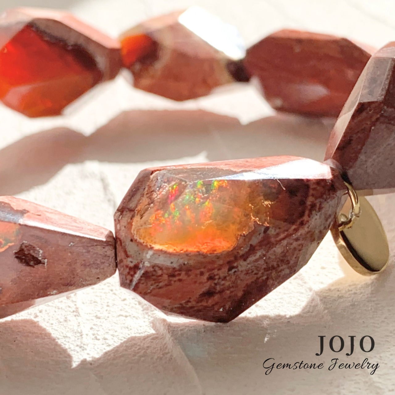 母岩によってそれぞれの個性が出る、ひとつとして同じ表情を持たない魅力的なカンテラオパールのタンブルカットビーズのみを使用してプレミアムなブレスレットに仕立てました。