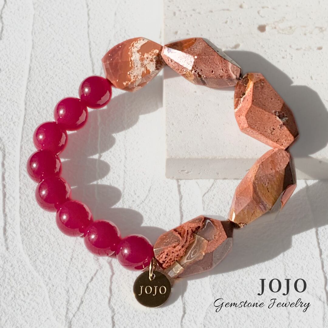そのルビーと、母岩によってそれぞれの個性が出る、ひとつとして同じ表情を持たない魅力的なカンテラオパールのタンブルカットビーズとを組み合わせてプレミアムなブレスレットに仕立てました。
