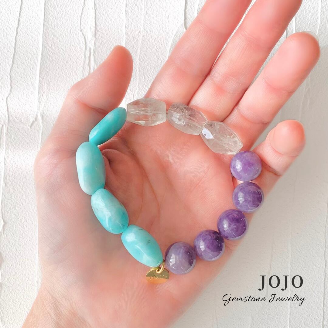 南国の美しい海を思わせる、温かく包容力のある鮮やかなブルーグリーンのアマゾナイトと、パープルとホワイトが混ざり合いやわらかなマーブル模様を描いたアメシスティンクォーツを合わせたハッと目を引く爽やかなカラーリングに、キラキラと虹色の輝きを閉じ込めたグリーンアメジストで柔らかな優しい煌めきを添えました。