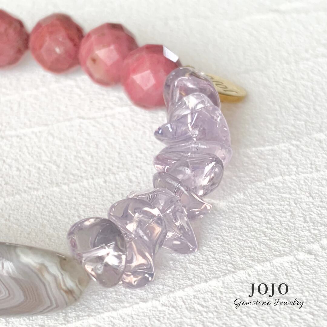 淡く優しいサーモンピンクとライトグレーに繊細な縞模様が描かれた芸術的なピンクボツワナアゲートと、クリアな瑞々しいパープルピンクのスコロライトを合わせ、華やかでナチュラル感もある女性らしいブレスレットにお仕立てしました。