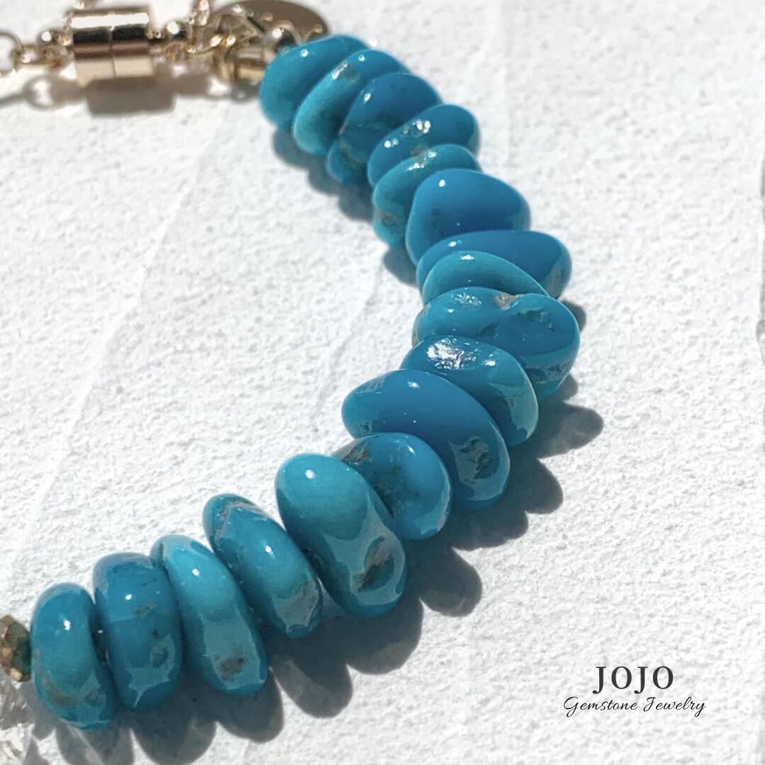 そんなスリーピングビューティーターコイズの目を見張るほど鮮やかなブルーのタンブルと、その高い透明度とダイヤモンドのような輝きをもつことからその名がつけられたニューヨーク産ハーキマーダイヤモンドを組み合わせた、贅を尽くした大人の為のラグジュアリーなブレスレットをご用意しました。