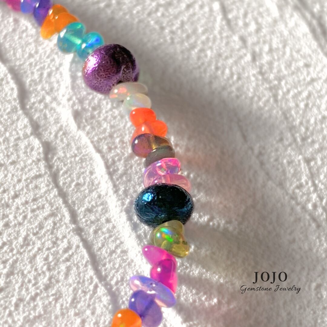 鮮やかなピンクやグリーン、パープルなどでコーティングされたメテオライトと、小粒ながら鮮やかなネオンカラーのベースにオーロラのような遊色効果が見られるオパールを合わせた、派手色でも安っぽくない、遊び心を忘れない大人の為のブレスレットです。