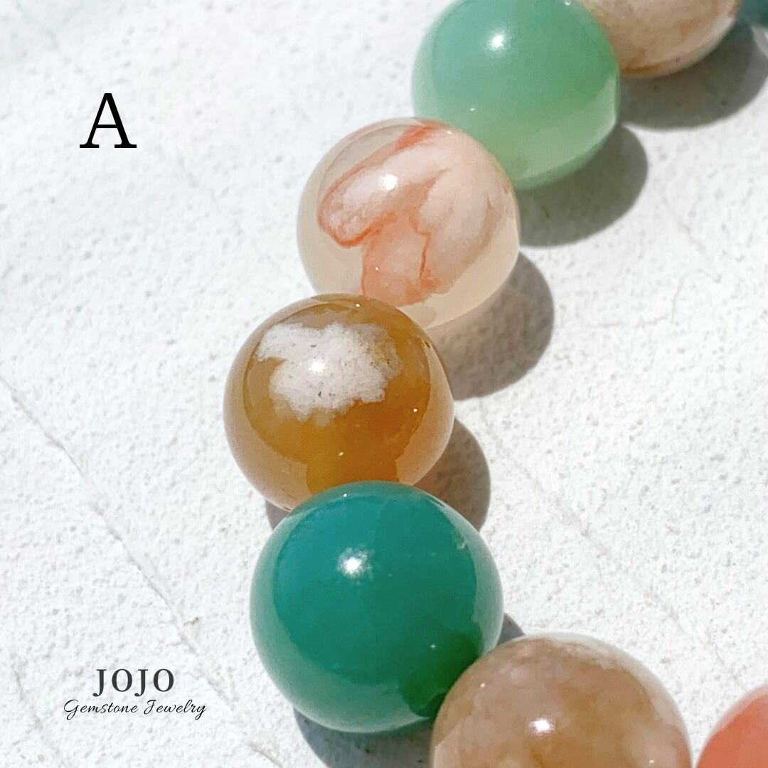 グリーン、オレンジ、イエローなどのキャンディカラーのチェリーブロッサムアゲートと、鮮やかなブルーグリーンのブルーオパールの大粒チップを組み合わせました。