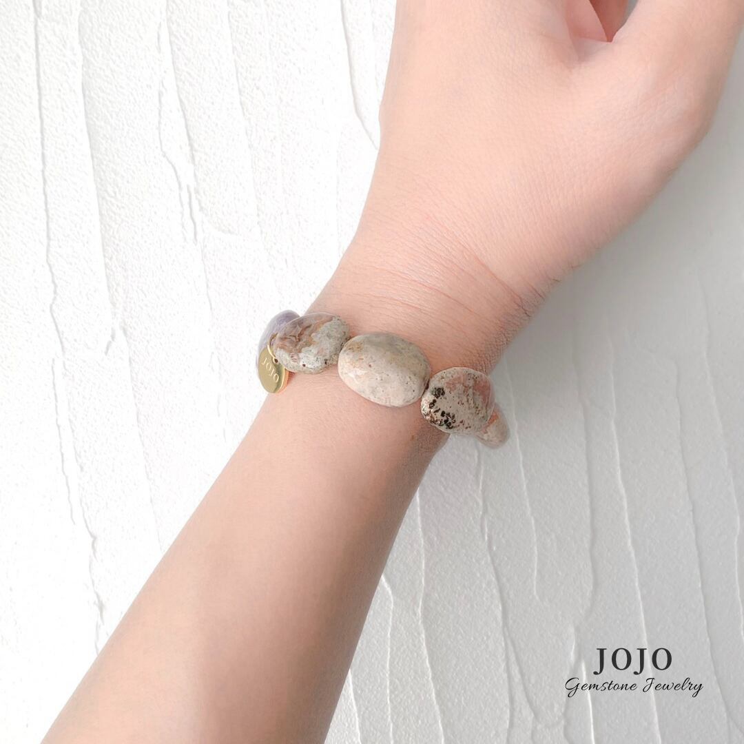 「石の質感」を残した個性豊かな大ぶりのタンブルに、パープルとホワイトのコントラストが美しいモラドオパールのオーバルシェイプを合わせたナチュラルな魅力溢れるブレスレットです。