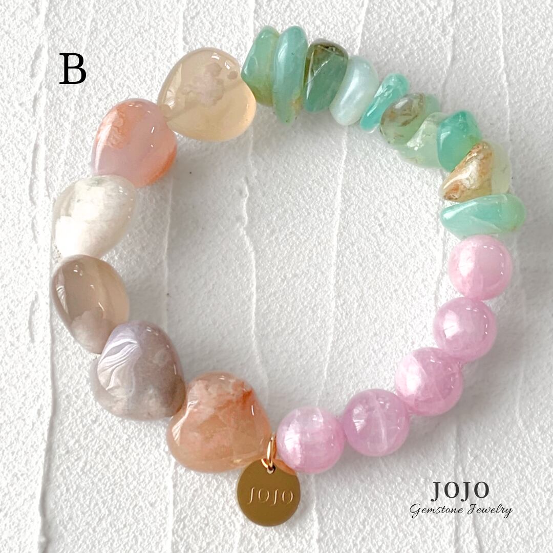 そこに花びらを散らしたような白い模様や儚い桜の様な淡いピンクのインクルージョンが可愛らしい優しいシアーベージュのチェリーブロッサムアゲートのハートシェイプをあわせ、「石」の魅力も存分に味わいつつ、キュートなカラーが乙女心をくすぐる、JOJOならではのデザインブレスレットです。