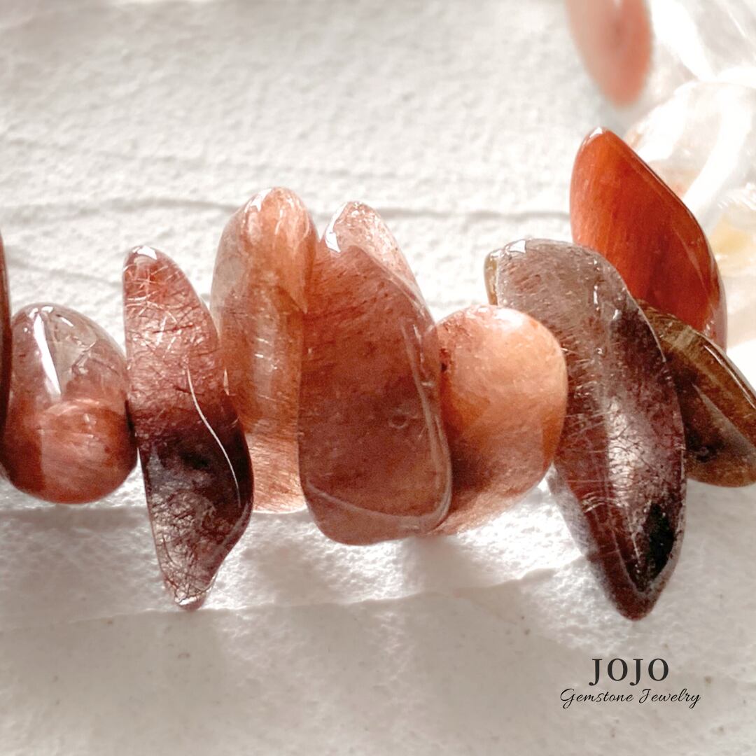 赤くキラキラと輝く針状インクルージョンを一粒一粒堪能できる大きめチップのレッドルチルクォーツを合わせました。