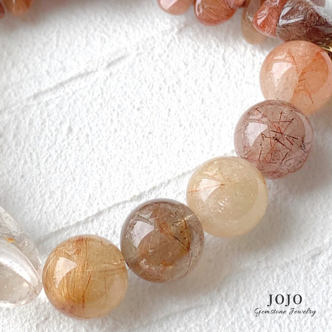 レッドルチルクォーツの大粒チップと、ゴールドやブロンズ、レッドなど一粒一粒カラーの違うコロコロ可愛いラウンドシェイプのミックスルチルクォーツを合わせました。