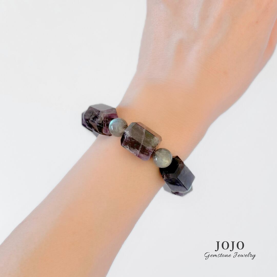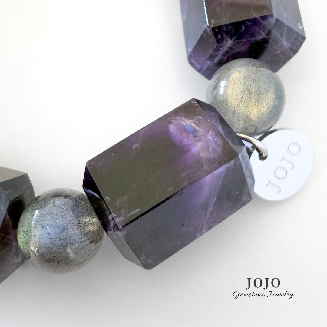 アメジストの中にはファントムやレインボーの輝きを見る事が出来る粒もあり、落ち着いたトーンの中にラブラドライトの神秘的なシラーが時折ギラつく程に輝きを放つ、ミステリアスな雰囲気漂うユニセックスなデザインブレスレットです。